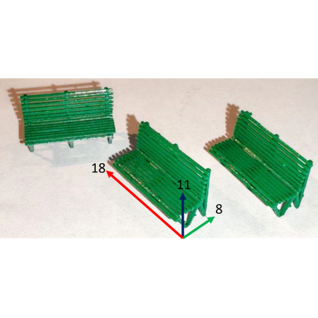 Panchina in scala H0 con seduta su un solo lato, ideale per arricchire parchi, stazioni e ambientazioni urbane nei plastici ferroviari. Realizzata in stampa 3d e già verniciata di verde, pronta per essere posizionata.